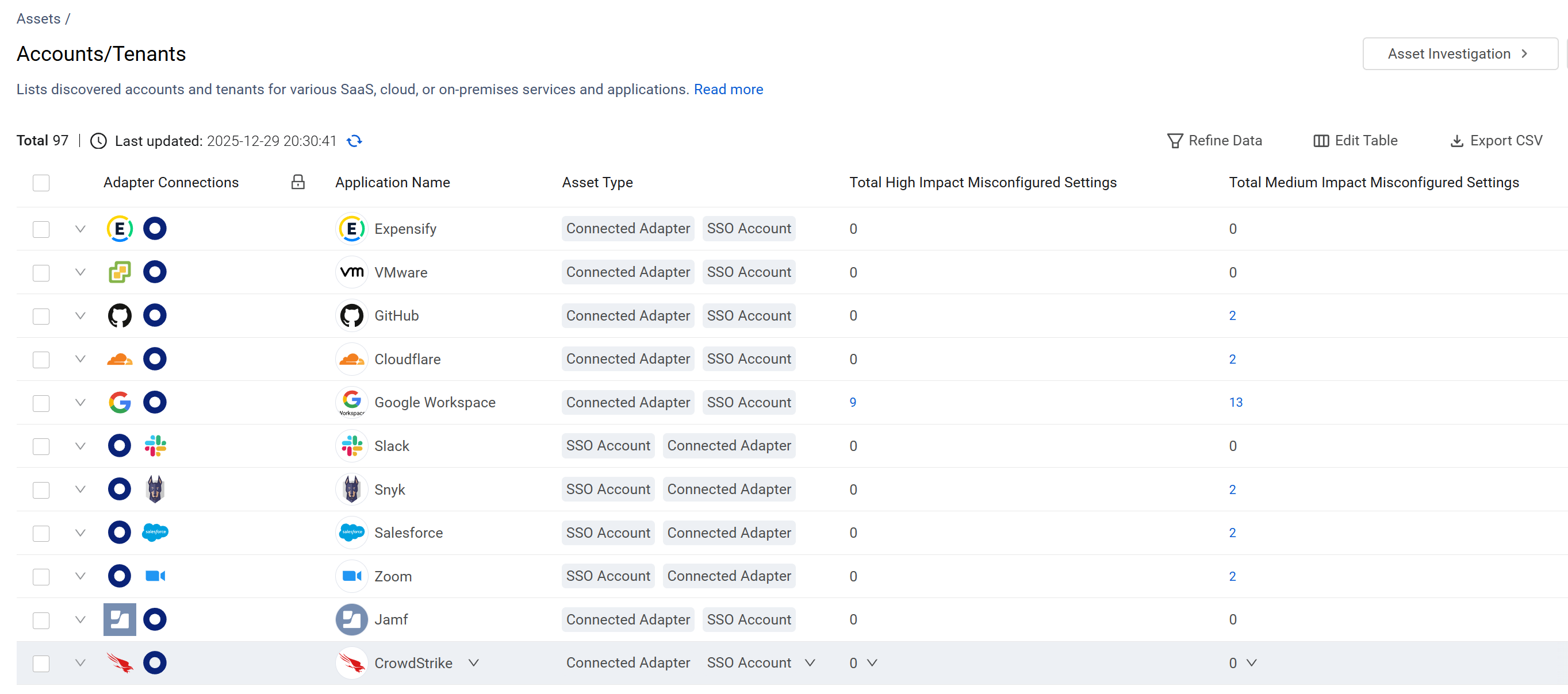 The security posture counter fields display the number of security misconfigurations found within a specific account. Clicking a value redirects you to the Application Settings asset page, pre-filtered for that account's specific findings.