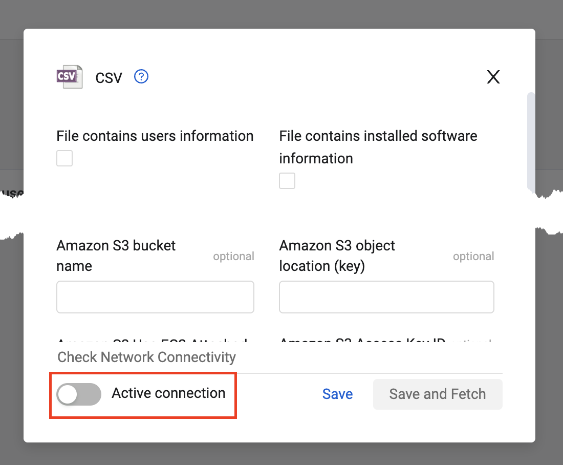 If you are uploading a file from an online storage location and you want to use this file only for custom enrichment, you must disable the Active connection setting on the CSV adapter connection. In this case, the CSV adapter connection will not fetch new assets.