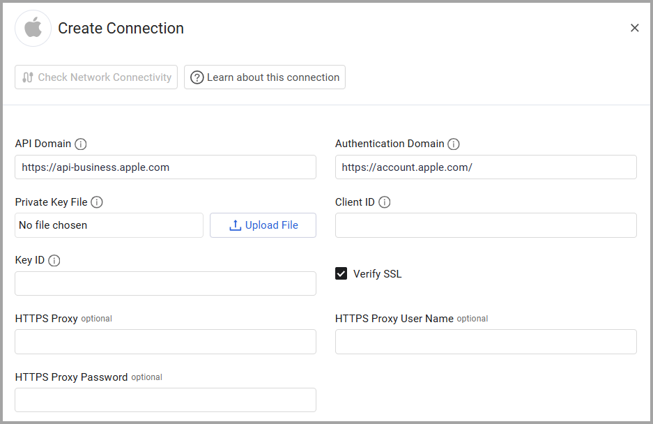Private Key File Upload the private key file in PEM format used to sign the JWT for OAuth 2.0 authentication. This key is used to sign JWTs as part of the OAuth Client Assertion process. The private key must correspond to the Key ID and Team ID issued in Apple Business Manager when registering the API integration.