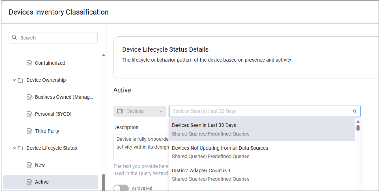 - Select a query representing the devices in this class. You can select an Axonius predefined query or create your own saved query. For example, under Device Lifecycle Status, you can define that devices seen in the last 30 days are considered Active: