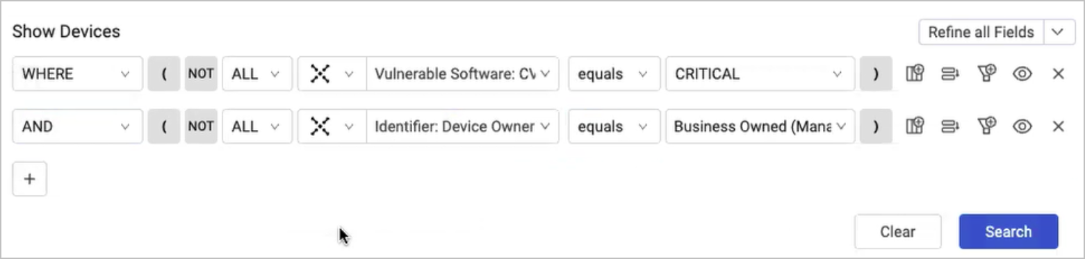 Device Inventory Classification also helps you find very specific contexts between device classes and security issues, leading to a better, more focused risk assessment. For example, you can show only Critical CVEs that exist specifically on Business-Owned (Managed) devices: