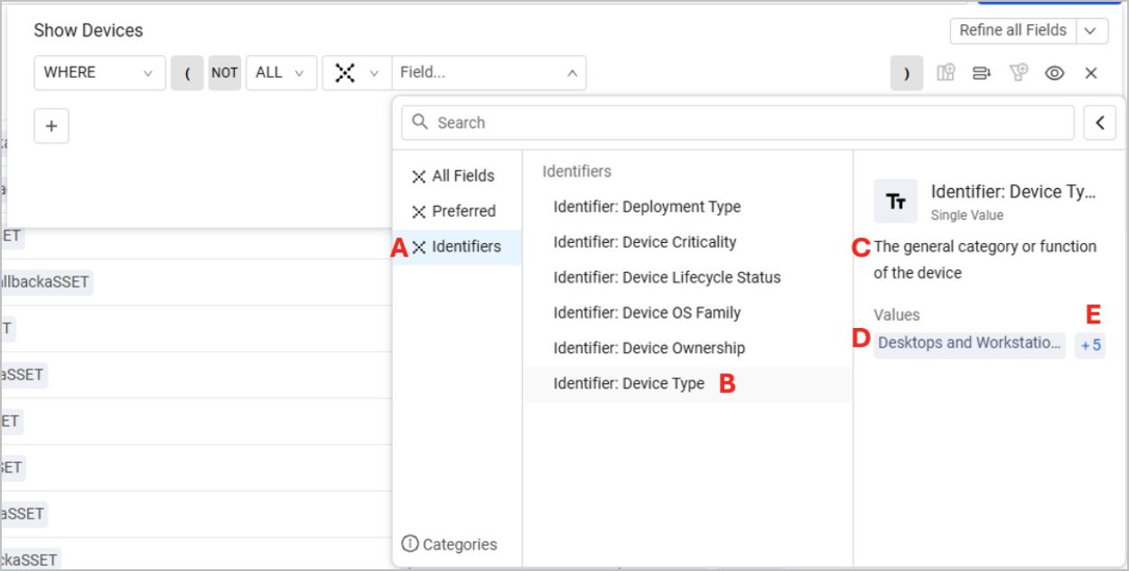 - In the Query Wizard, from the Field drop-down, select Identifiers. This displays all device categories (A).
