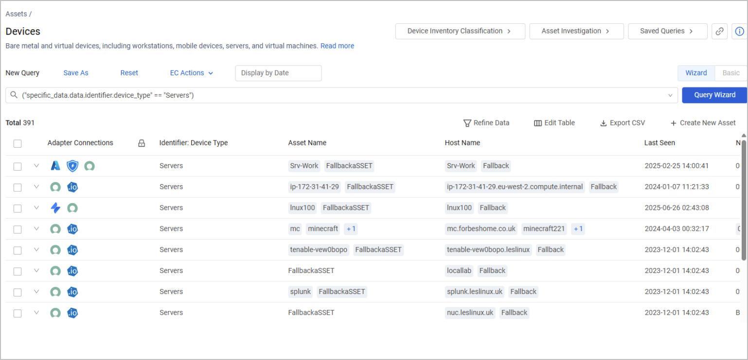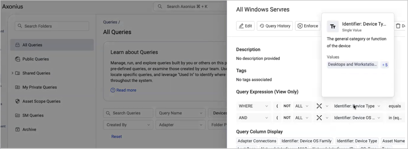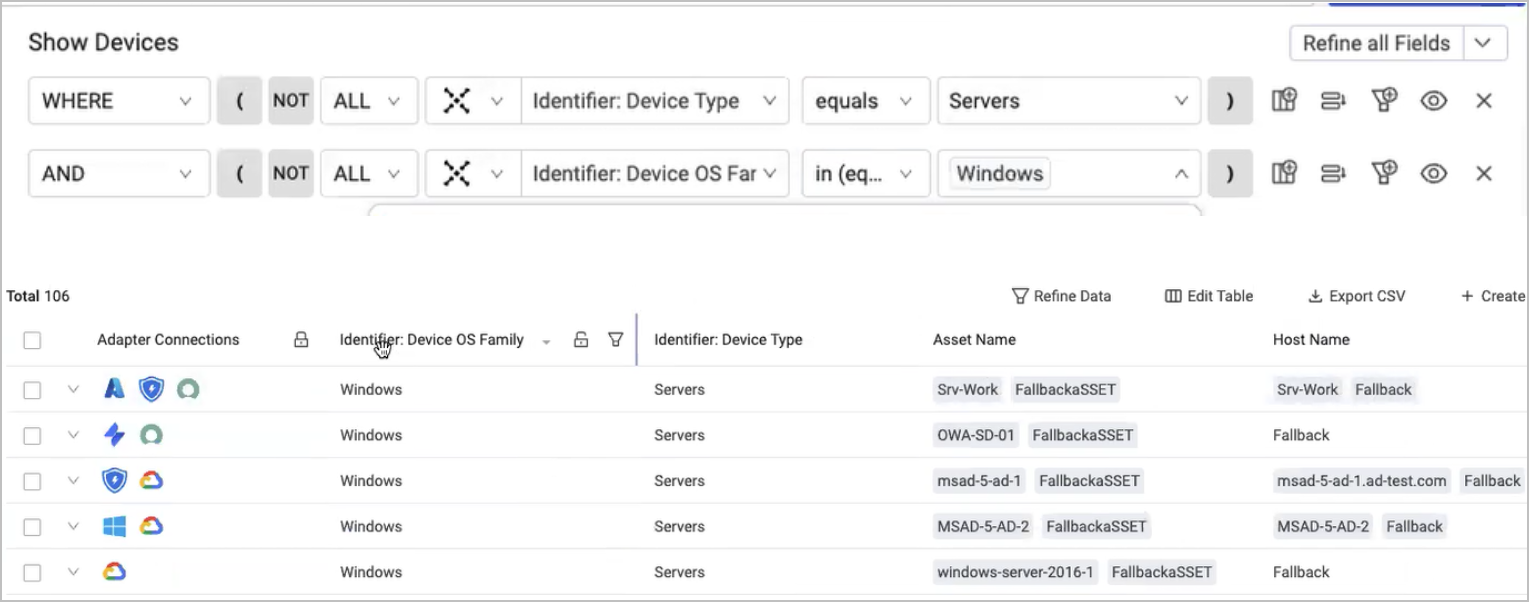 To explore the relations between different device classes, you can build more complex queries with more than one identifier. For example, show devices whose Device Type is Servers and whose Device OS Family is Windows:
