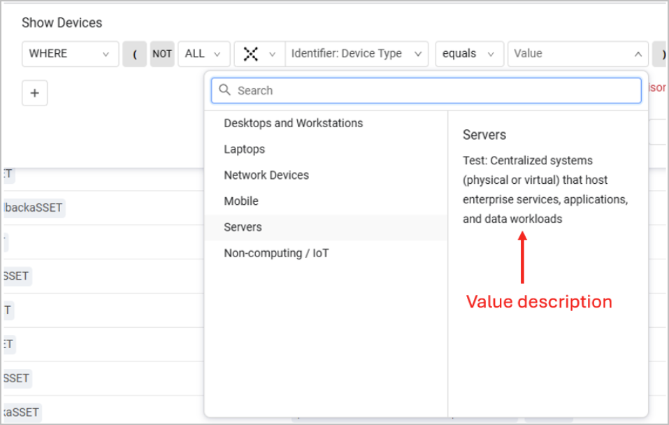 - From the Value field, select the class to filter results by. In the following example, we want to display devices whose Device Type is Servers: