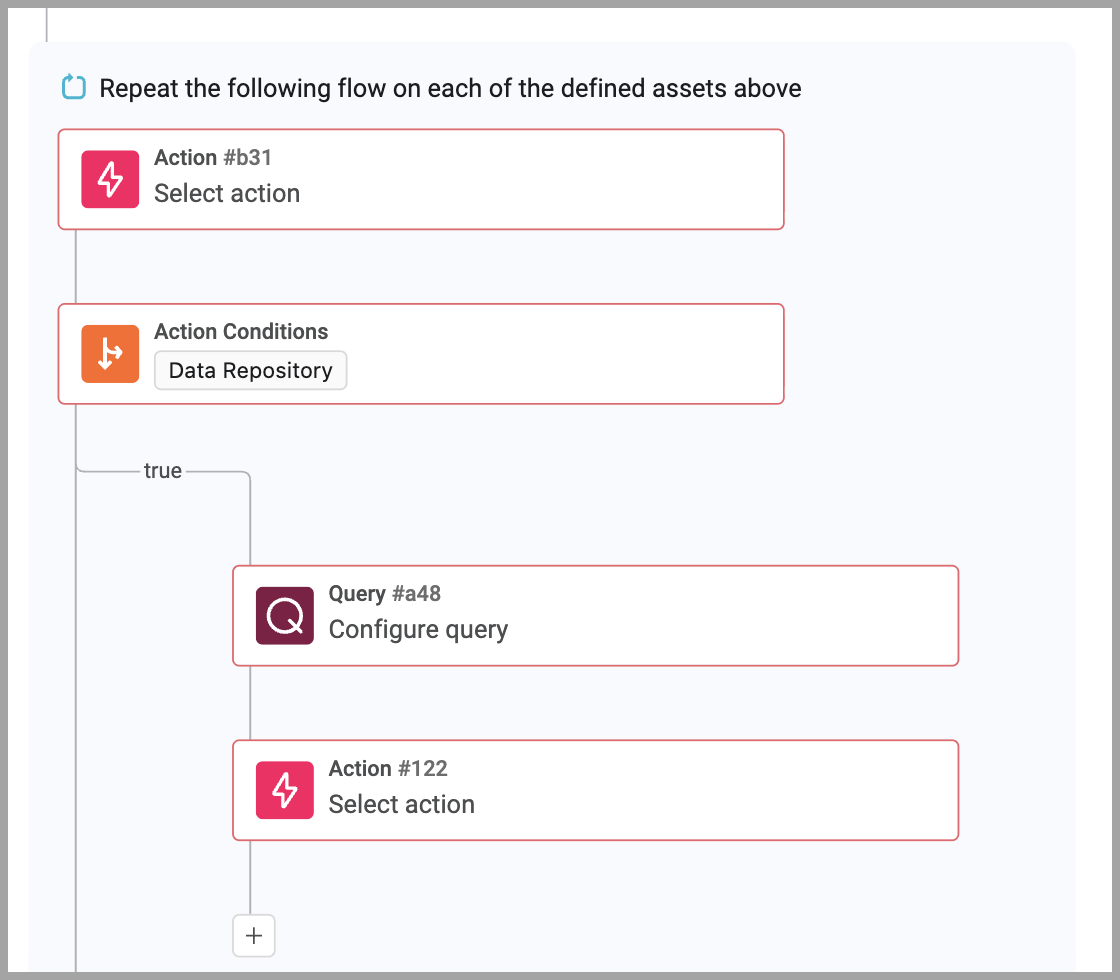 When you add a Repeat For Each node, a second execution branch is created, allowing you to add nodes that will run on each returned asset. Assets returned in a previous node/step are passed to the Repeat For Each node and processed one by one.