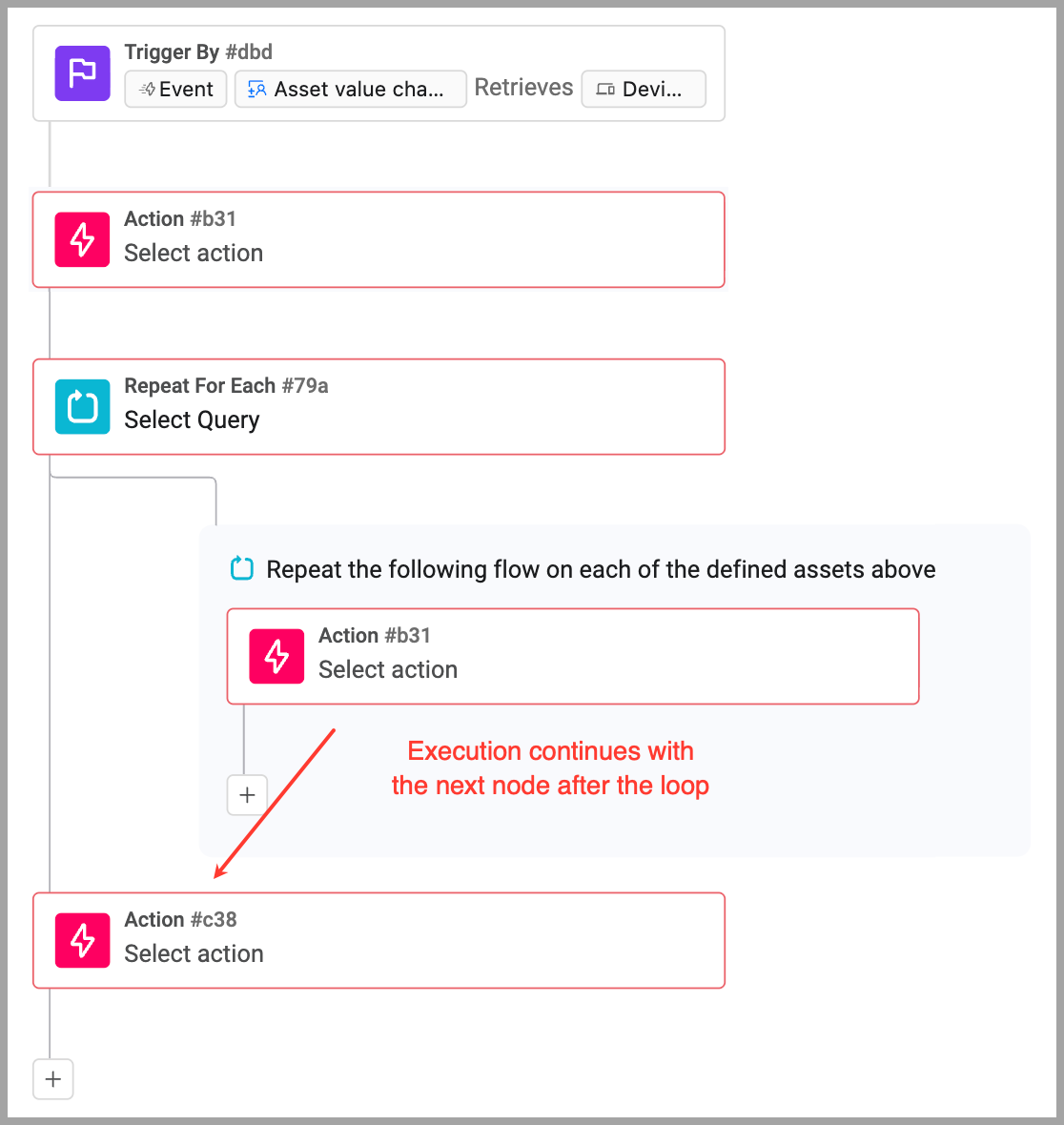Many workflow triggers and actions return multiple assets. By default, the workflow is run for each asset returned. Using the Repeat For Each node, a single workflow is run to process all the returned assets. This requires fewer resources than running the workflow for each asset.
