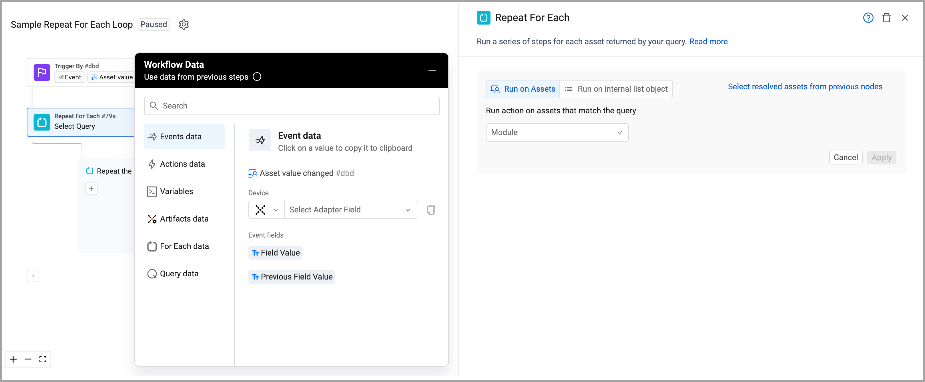 Repeat For Each. The Workflow Data dialog and the configuration drawer open.