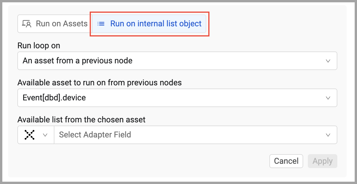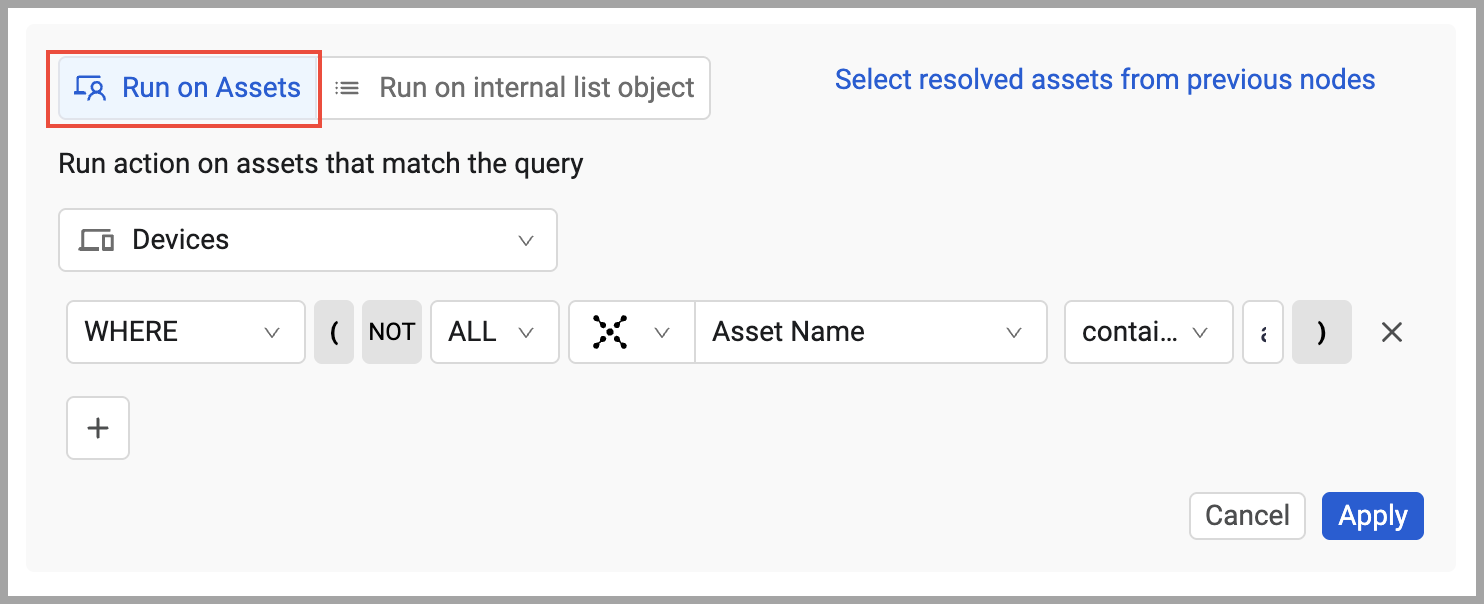 To run the loop on assets returned by a previous node in the workflow, click Select resolved assets from previous nodes, select the node from the Run action on resolved assets from previous nodes list, and click Apply.