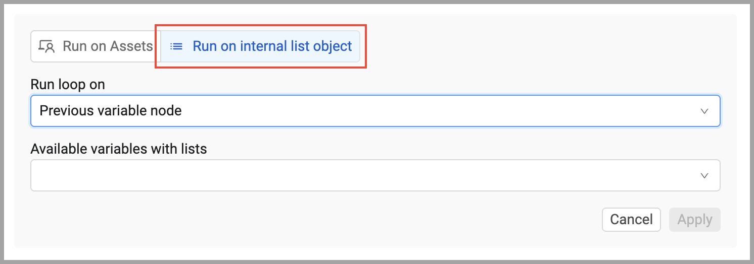 In Available variables with lists, select the variable that contains the list of assets on which you want to run the loop.