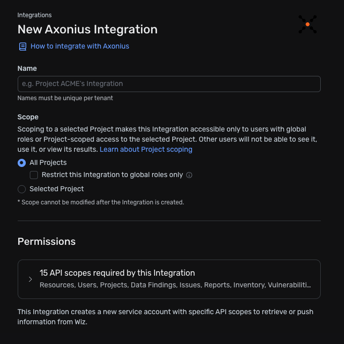The Wiz Axonius integration is required for this deployment. The appropriate permissions will be set automatically by the integration, which is vetted and tested by Axonius and Wiz.