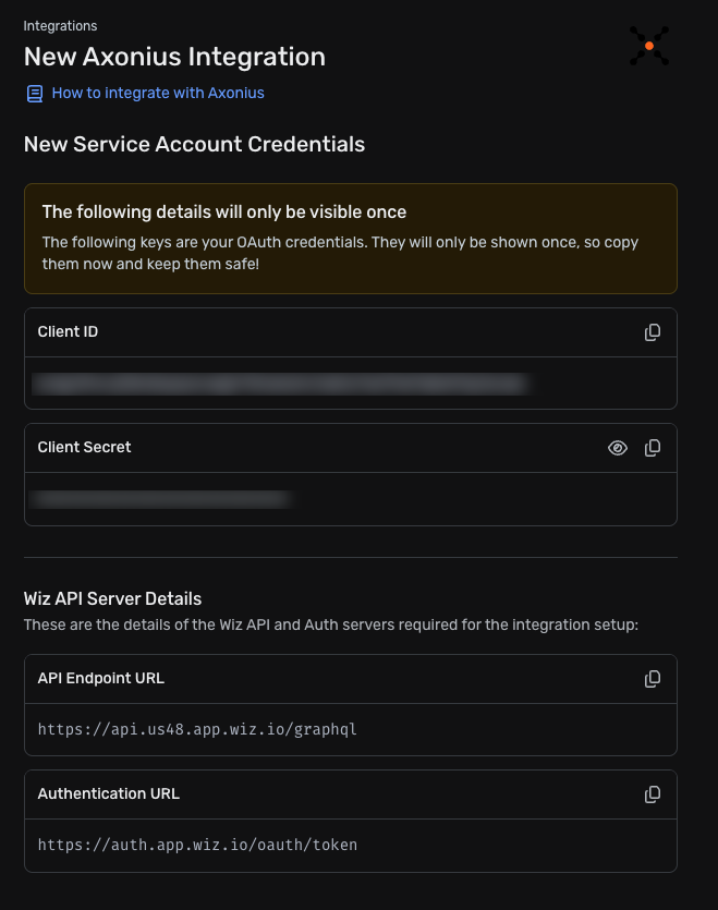 - Client Key and Client Secret - Input the Key and Secret from the Axonius Integration Service Account. See Configuring Wiz Axonius Integration for details about how to obtain these parameters.