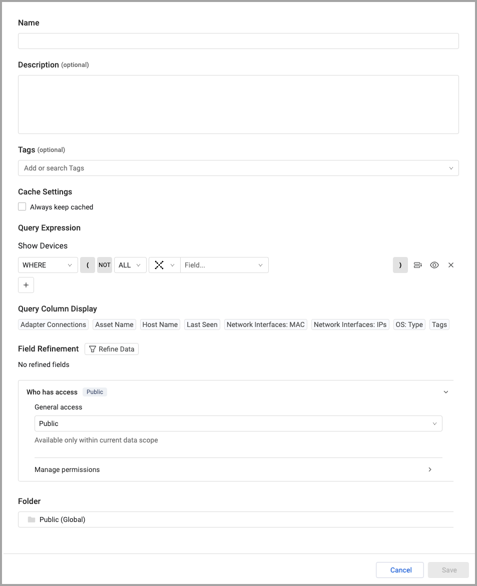 - In Folder, select the folder where the new query will be saved. Depending on the access configuration, the folder may be selected automatically.