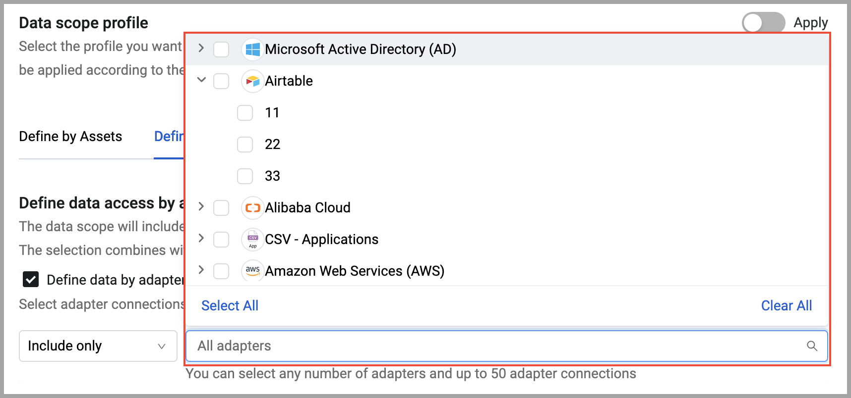 - Define by Adapter - The list of assets included in the data scope is defined by the selected adapter connections. Only those assets are included. However, the data for these assets can come from any adapter connection.