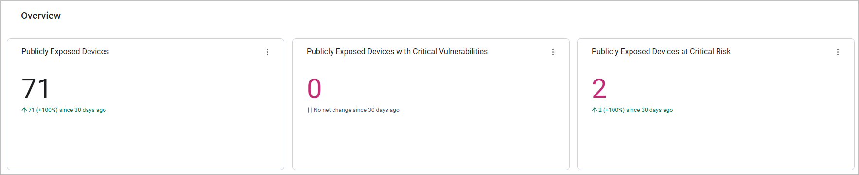 The Overview section at the top of the page provides a simple, straightforward view of your most critical assets that are exposed to the public internet. It shows data the following data: