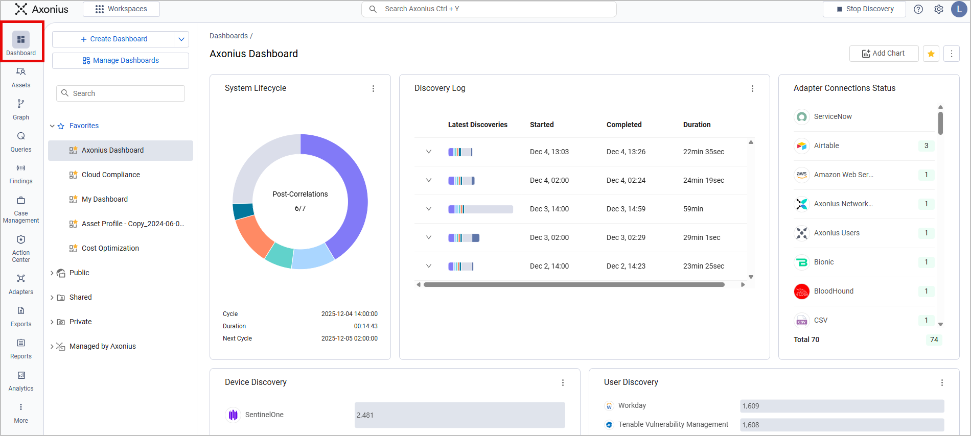 | Dashboard | The Dashboard provides a single, consolidated, and central area to monitor and absorb insights on all assets based on saved queries designed to shed light on desired policy, breach of policy, and any other questions regarding asset management. The Dashboard page opens by default every time you log in to Axonius. | |