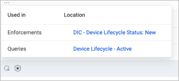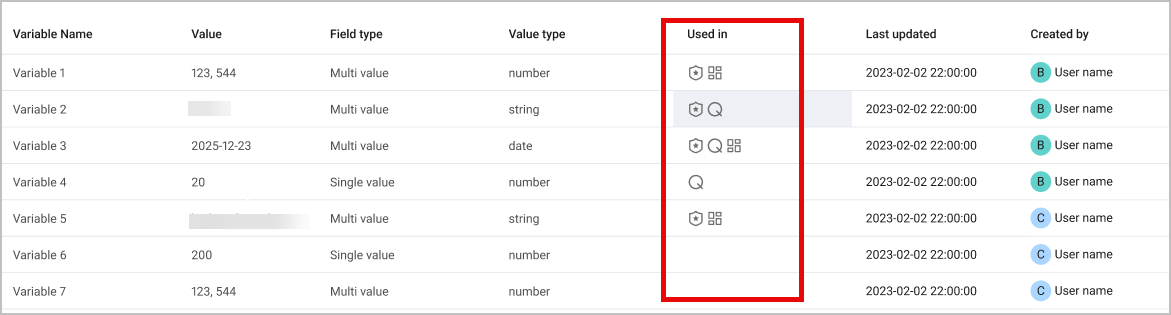 Hover over the value of Used In to see in which Queries, Enforcement Actions, or Dashboards this variable is used.