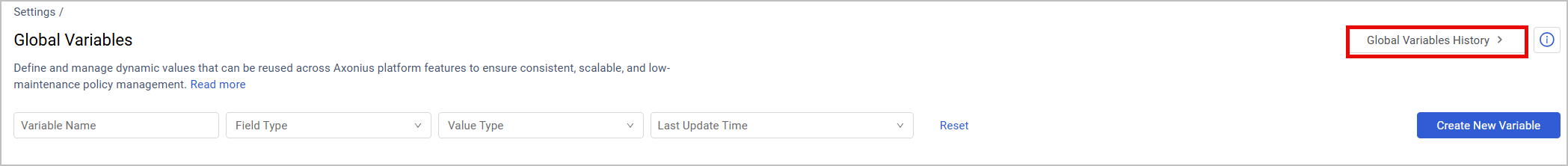Use the Global Variables History page to track changes in your variable values over time. Monitoring variable values helps identify abnormal behavior in a specific asset or a set of assets in the system. For example, if you see that a variable pointing to some software version barely ever changes, you might want to make sure your organization is indeed working with the most updated version.