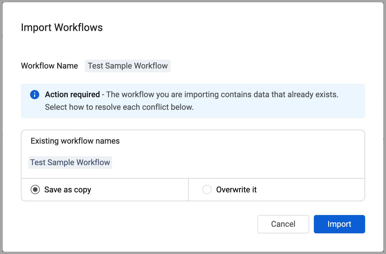 Click Import. The imported workflow is added to the Workflows page, and the selections from the previous step are implemented.