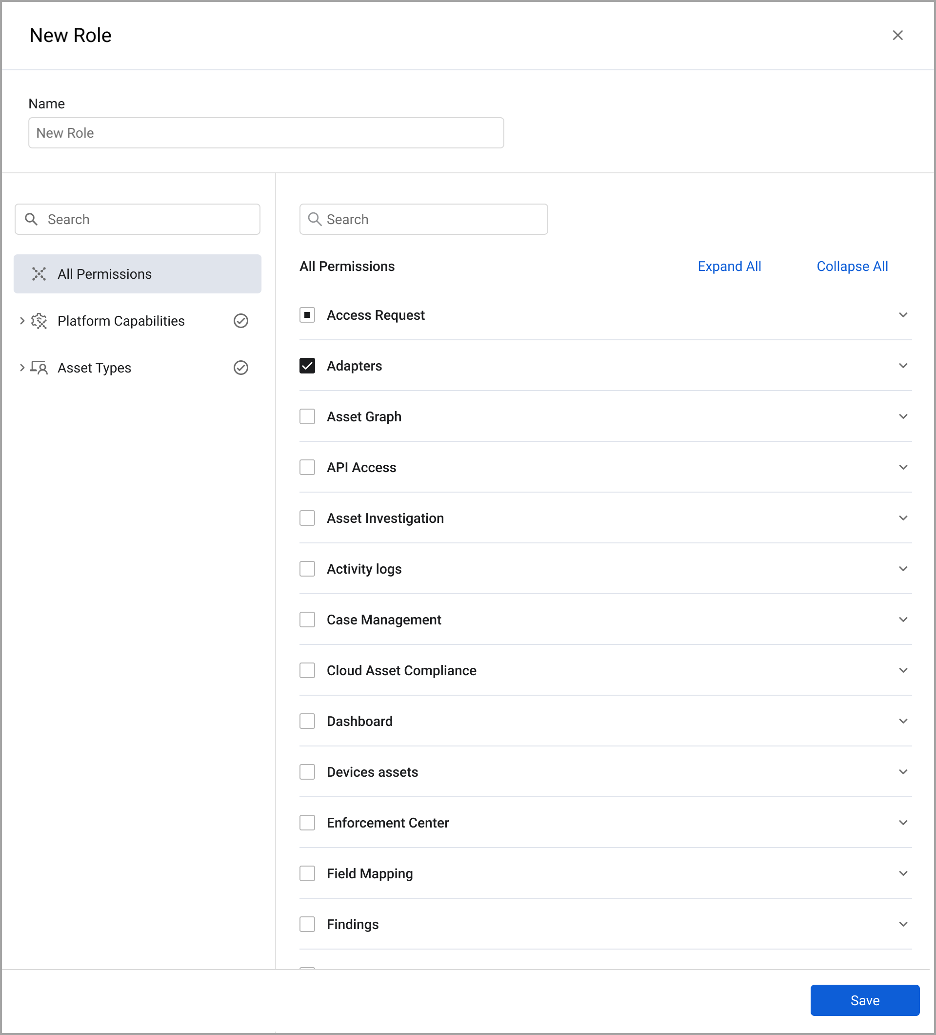 - Click Asset Types or expand it to select permissions to specific asset types. Asset types are sorted as they appear on the Axonius Assets page.