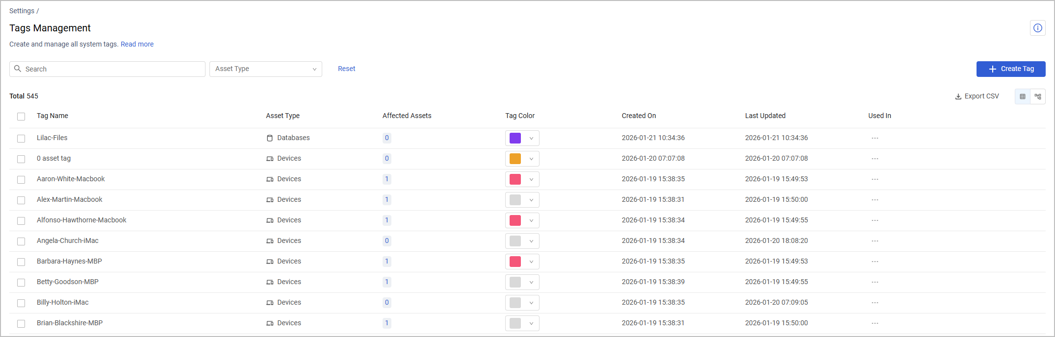 Use Tags Management to manage all tags in the system from one central location without viewing the details of a specific asset. This includes tags added in the following ways: