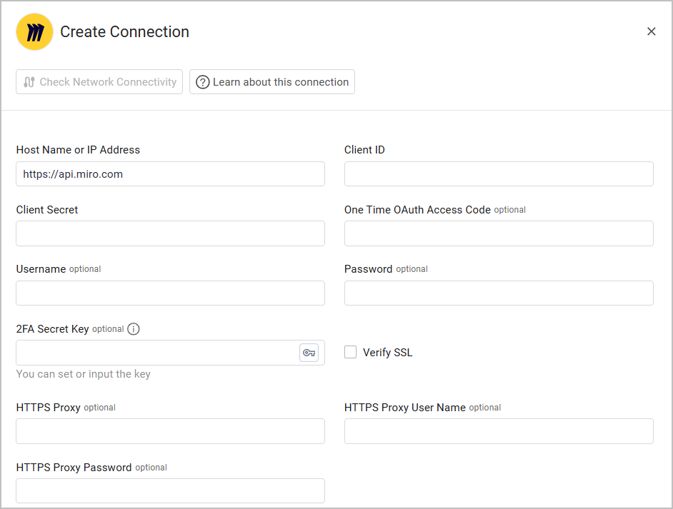 Client ID and Client Secret - Miro Authentication credentials. Refer to Get started with OAuth2.0 and Miro.