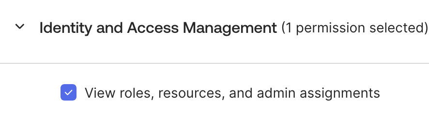 - Create a custom role with the View roles, resources, and admin assignments permission.