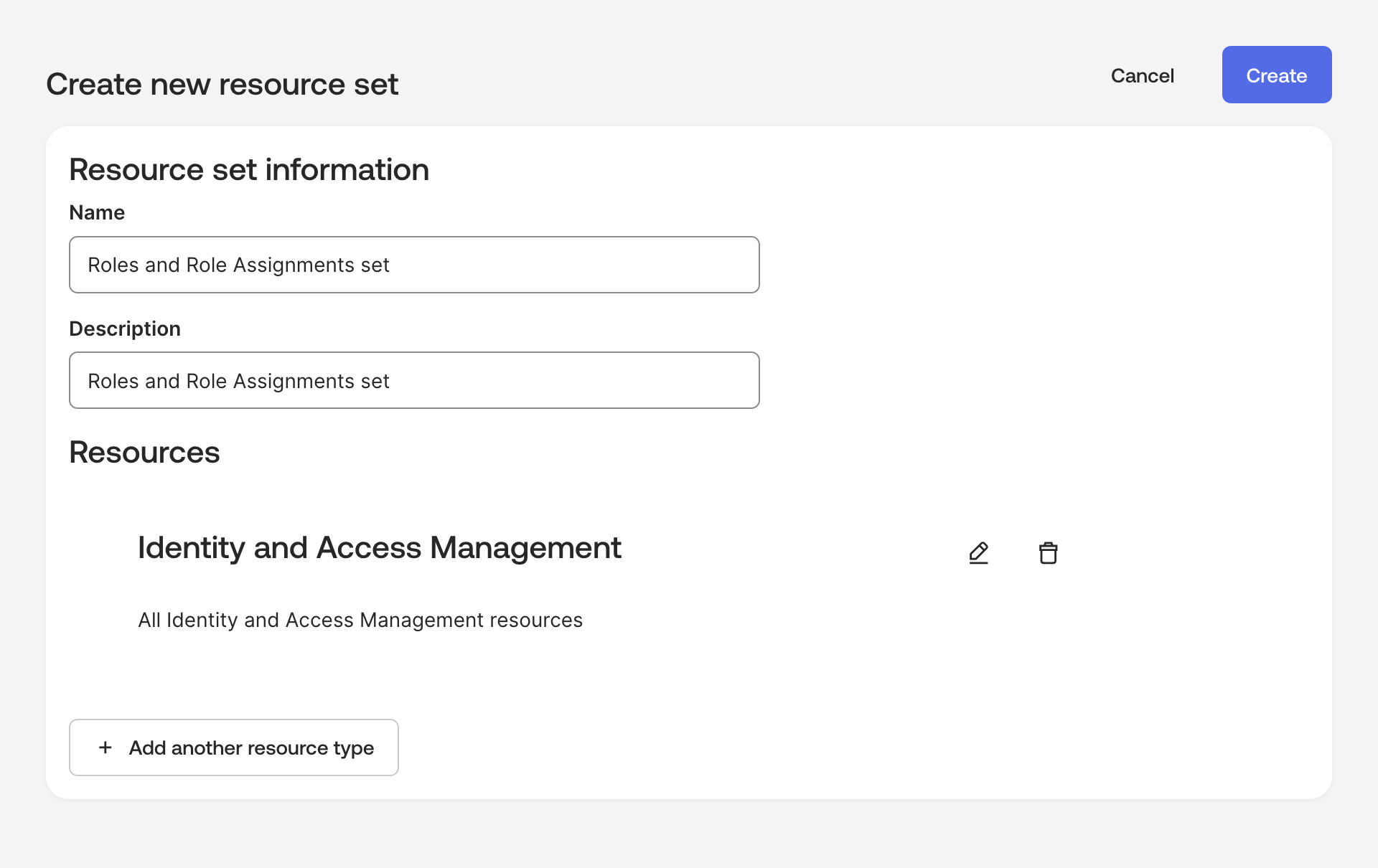 - Create a resource set for Roles and Role Assignments and add the All Identity and Access Management resource.