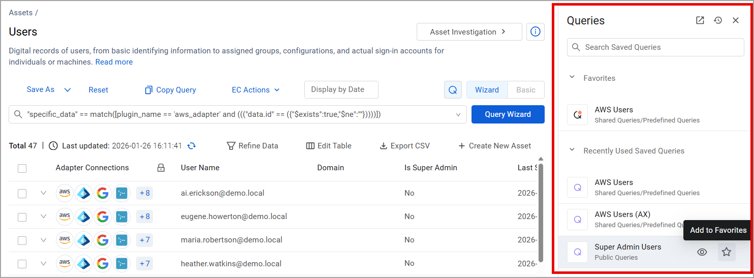 The Queries pane opens on the right and displays the Recently Used Saved Queries. Use the search bar to search for saved queries. You can also add a saved query to your Favorites for quick access.