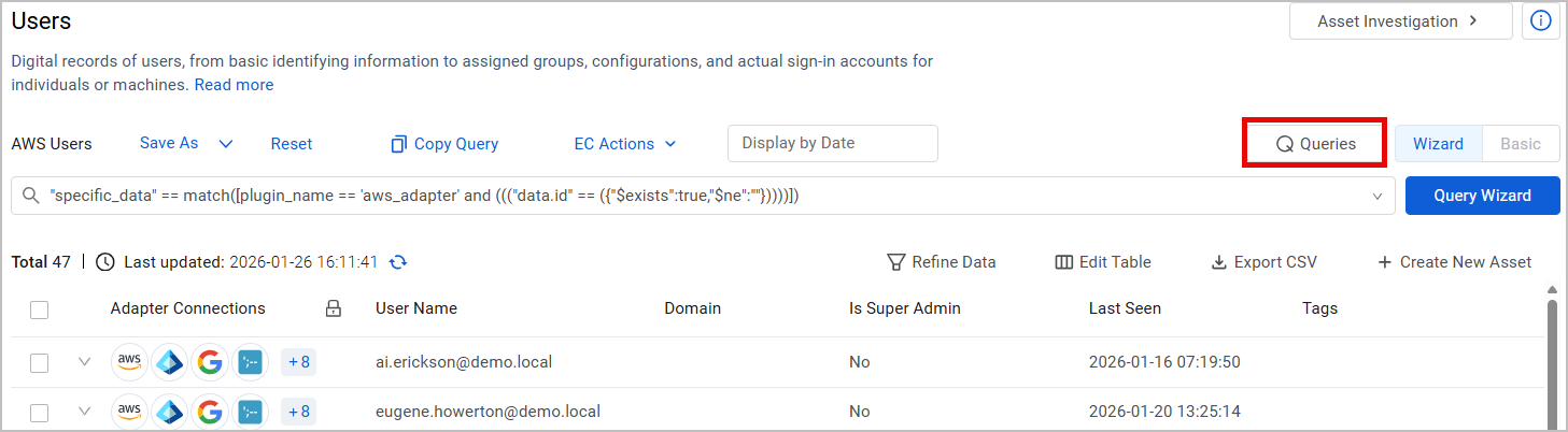 From each Assets page, you can access information regarding the saved queries run on this asset type. To get started, click the Queries button, located above the Assets page's search bar.
