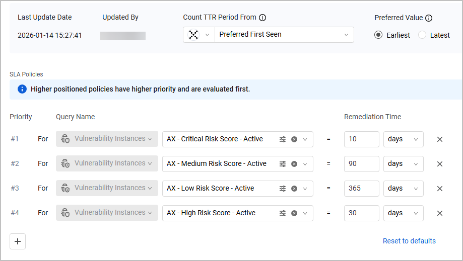 - Count TTR Period From - The system starts counting the Time-to-Remediate (TTR) period from the detection date of a specific field. Select a field to start counting the TTR from its detection date.