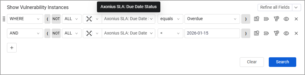 Use these fields to create meaningful queries to explore vulnerabilities in specific SLA contexts. For example, show overdue Vulnerability Instances whose remediation deadline was before a specified date: