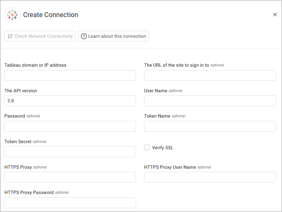 - Token Name and **Token Secret **- An API Key and Secret associated with a user account that has permissions to fetch assets. For information on how to obtain a token, see Tableau: Tools, REST Basics, and Sign In.