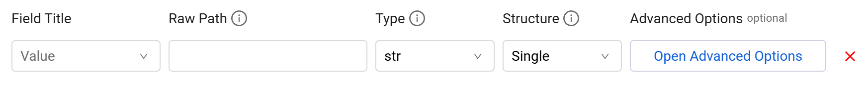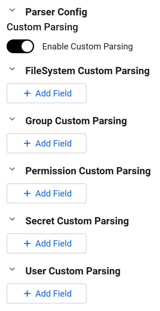 - FileSystem Custom Parsing - Click + Add Field to define custom field mappings for file system assets. You can define more than one custom field, and you can remove a custom field by clicking the red