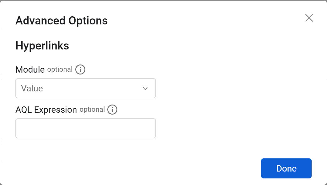 - Advanced Options (optional) - Click Open Advanced Options to open a pop-up box for configuring field hyperlinks, including: