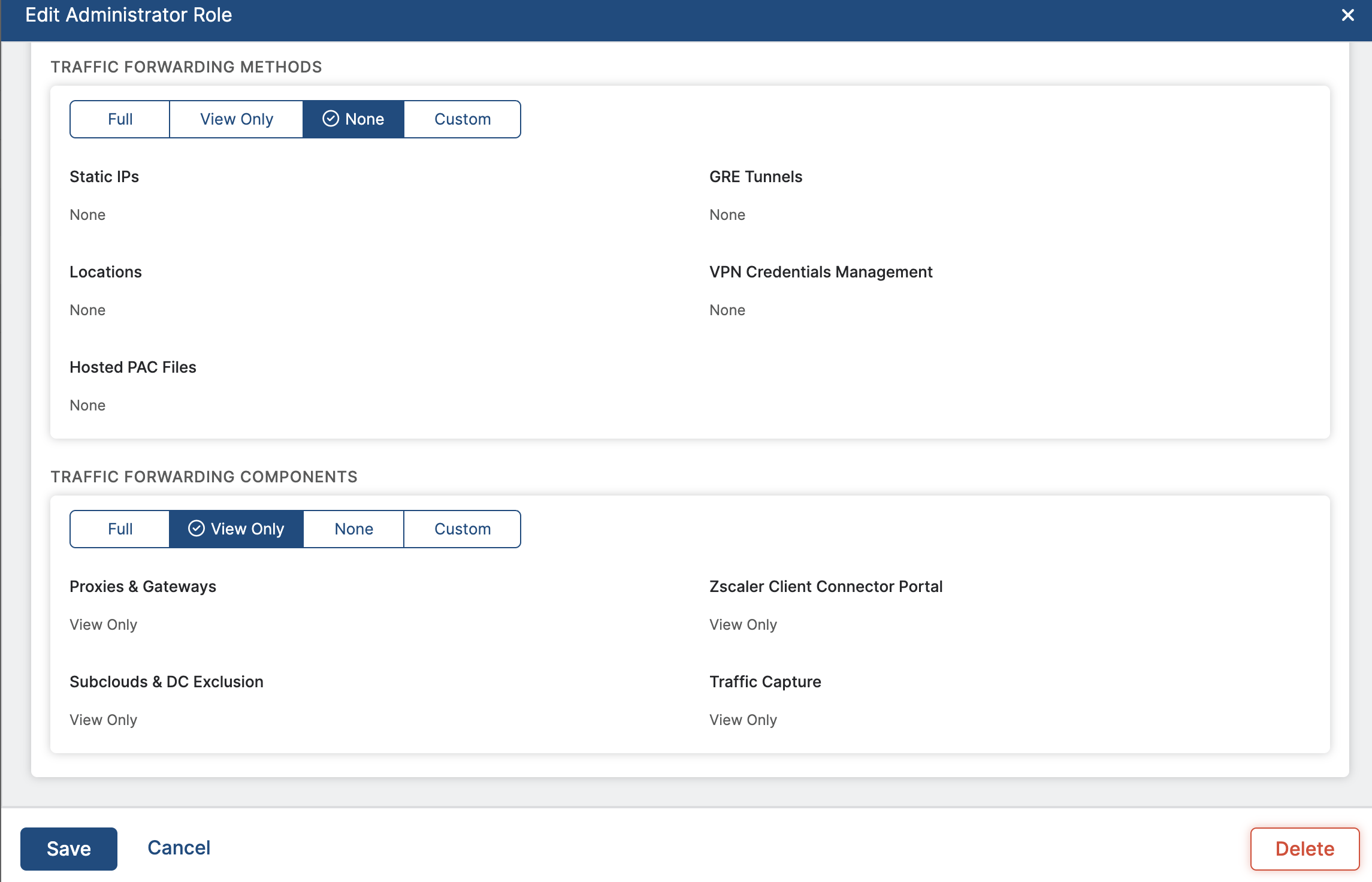 In Zscaler, under the Edit Administrator Role section, enable the following permissions: