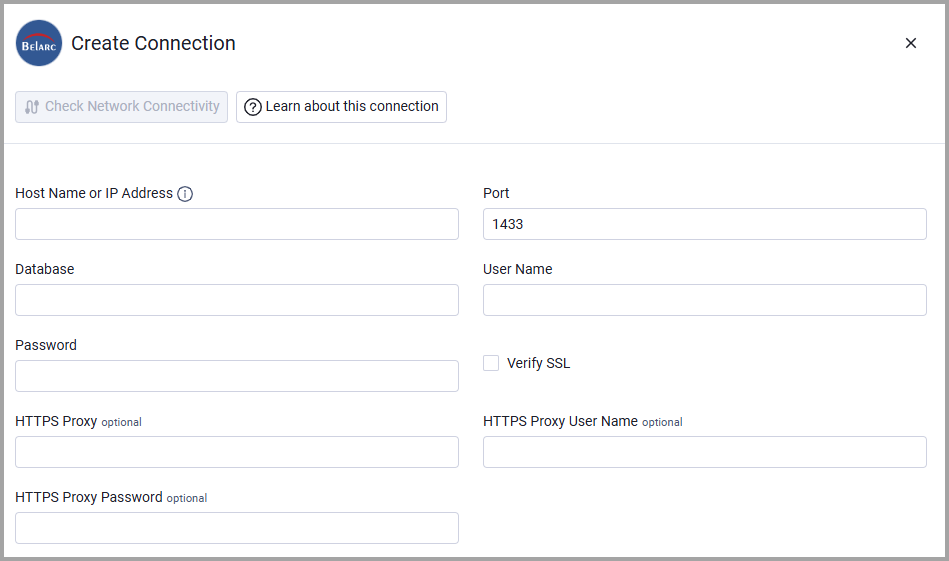 - Host Name or IP Address - The hostname or IP address of the Belarc BelManage SQL Server. Example: