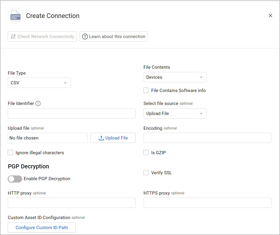 - Enable PGP Decryption (optional, default: disabled) - Enable this option to decrypt a PGP-encrypted CSV file. When enabled, you need to provide your PGP credentials: PGP Private Key and PGP Private key passphrase (optional).