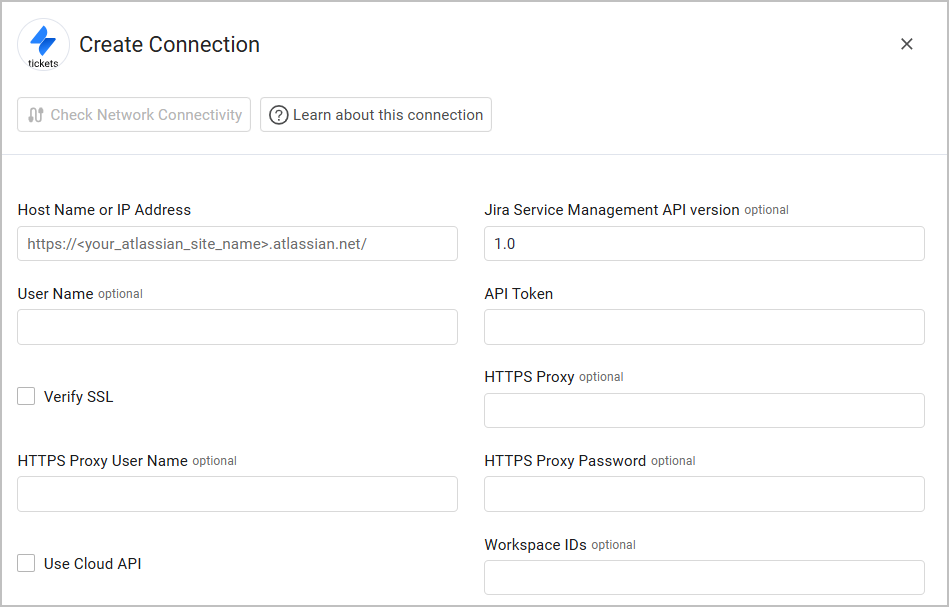 Host Name or IP Address - The hostname or IP address of the Jira Service Management (Jira Service Desk) server.