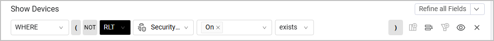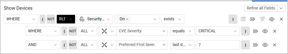 You can add more conditions (rows) to the query by clicking +. The suggested fields depend on the selected asset type. For example, you can show devices that have critical Security Findings that were first seen in the last 7 days: