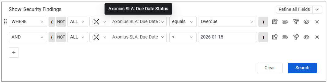- Axonius SLA: Due Date - The calculated remediation deadline, indicated by the following format: "in X days" or "X days ago". Hover over the value to see the exact deadline date.
