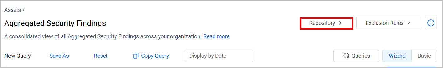 To view the Vulnerabilities Repository, go to the Aggregated Security Findings page and click Repository.